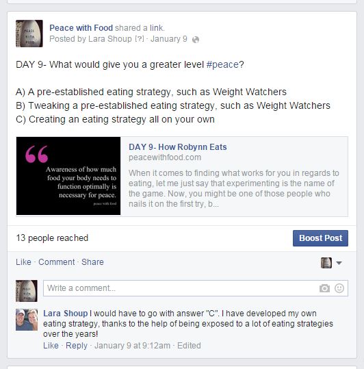 What to Expect: Daily posts focusing on different aspects of Peace with Food. The daily posts are listed at the end of this post for quick retrieval. Each day you will read the post that corresponds to the day you are on. You might consider jump-starting your experience by discussing with your posse the four posts we have linked above.