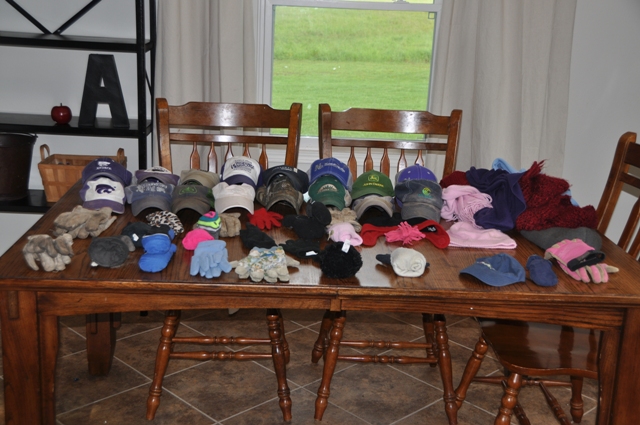 Here are some examples of decluttering by category. I laid out every hat or accessory we had in the house: